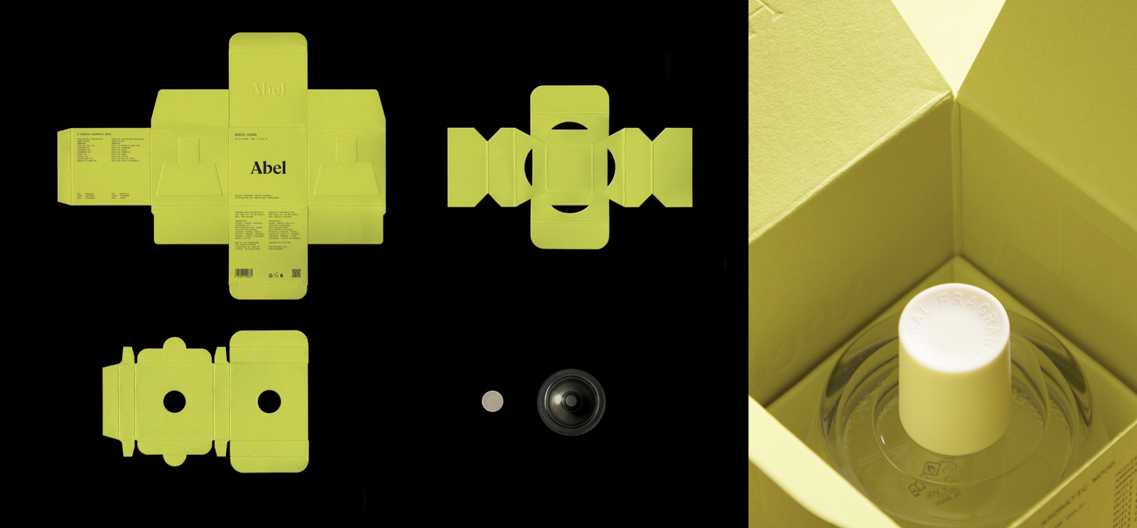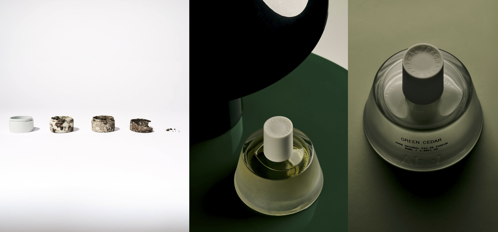 Abel의 브랜드 아이덴티티는 '예술, 윤리, 자연과학'이라는 세 가지 핵심 가치를 바탕으로 표현되었습니다. 로니 혼의 조각 제품에서 영감을 얻은 원뿔형 보틀 디자인은 원초적이고 견고한 느낌을 주며 샌드블라스트 처리된 질감의 표면과 물웅덩이처럼 매끄러운 상단의 형태를 통해 그 무드를 더욱 부각시킵니다. 향수 뚜껑 또한 가정에서 퇴비화 가능하고 생분해되는 생명공학 유래 소재로 제작되었습니다.
