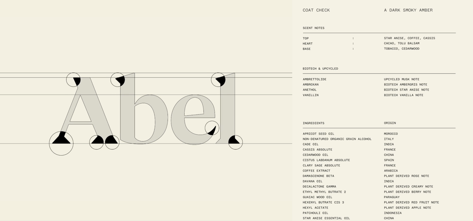 Abel은 전직 와인메이커 Frances Shoemack이 2013년 설립한 현대 천연 향수 브랜드입니다. 전체 향료 분자의 약 95%가 화석연료에서 유래한다는 사실을 알게 된 창립자 Shoemack은, 자연 유래 향수도 충분히 정교하고 퍼포먼스가 뛰어날 수 있음을 증명하고자 향료 농도를 37% 높여 제품을 재구성했습니다. 그 결과, 더 강한 지속력과 개성을 확보하면서도 석유화학 성분은 0%로 유지하는 성과를 만들어냈습니다.
