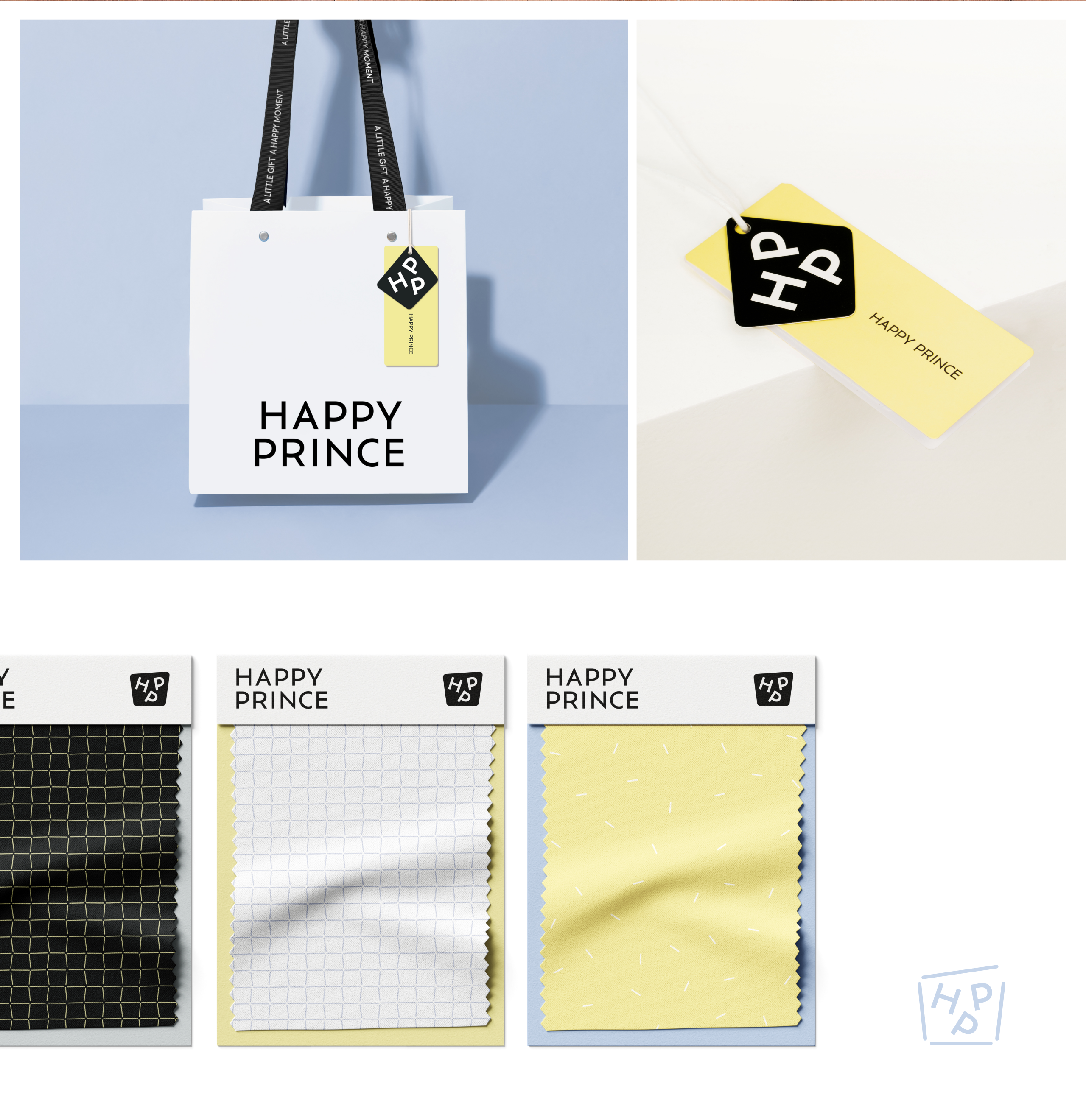 해피프린스의 로고타입은 깔끔하고 군더더기 없는 서체로 일상의 담백함을 표현하고, P와 R의 곡선에 작은 변화를 주어 일상 속 작은 선물을 발견하는 듯한 즐거움을 담았습니다. 심볼타입 로고는 매일의 일상이 선물 같은 시간이 되길 바라는 해피프린스의 마음을 선물상자 형태에 담아 표현했습니다.