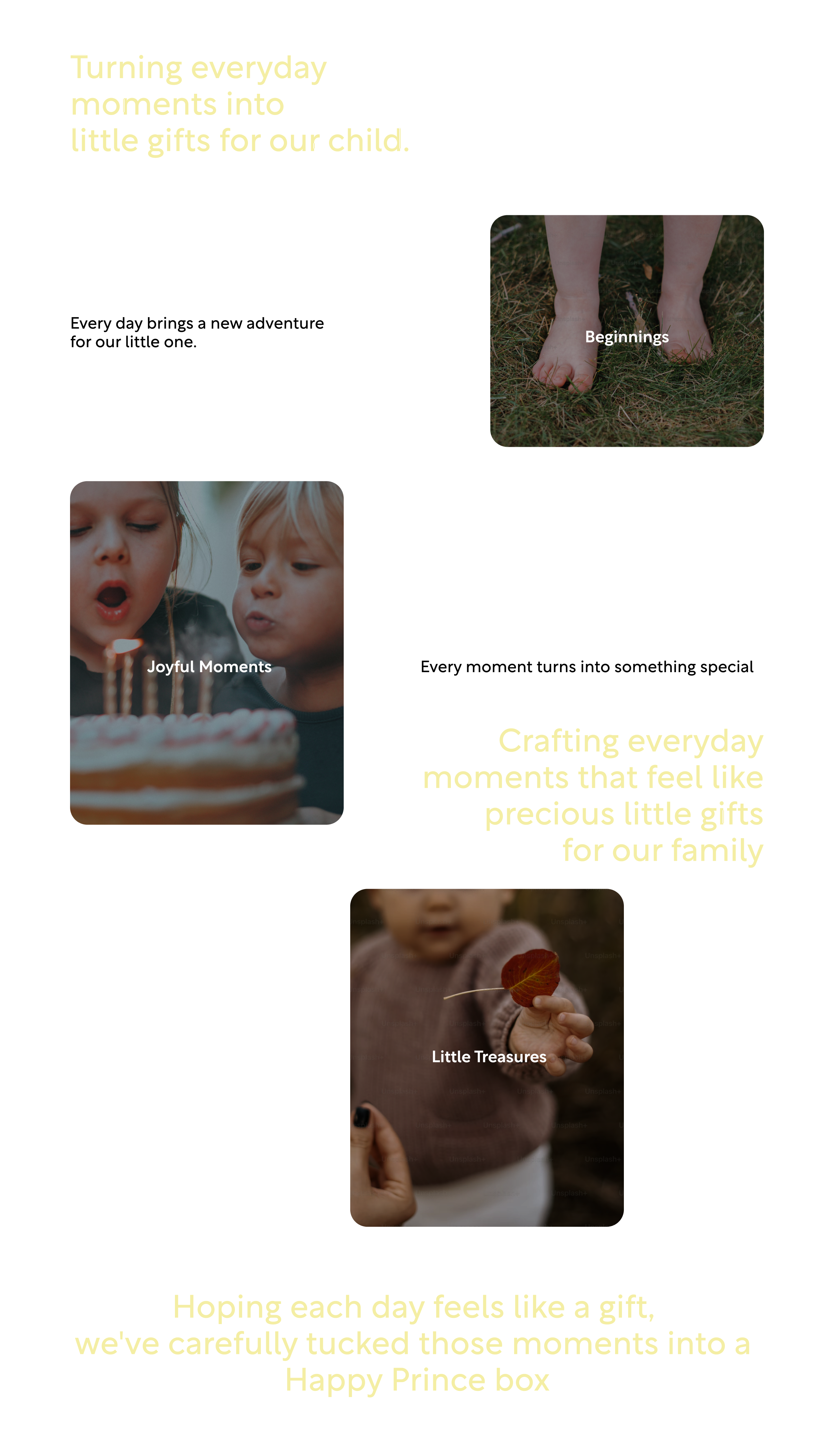 The Happy Prince logotype uses a clean, uncluttered typeface to convey the simplicity of everyday life, with subtle curves in the letters P and R adding a touch of delight—like discovering a small gift in daily moments. Its symbol-type logo embodies the brand’s wish for every day to feel like a precious present, expressed through the form of an opening gift box.