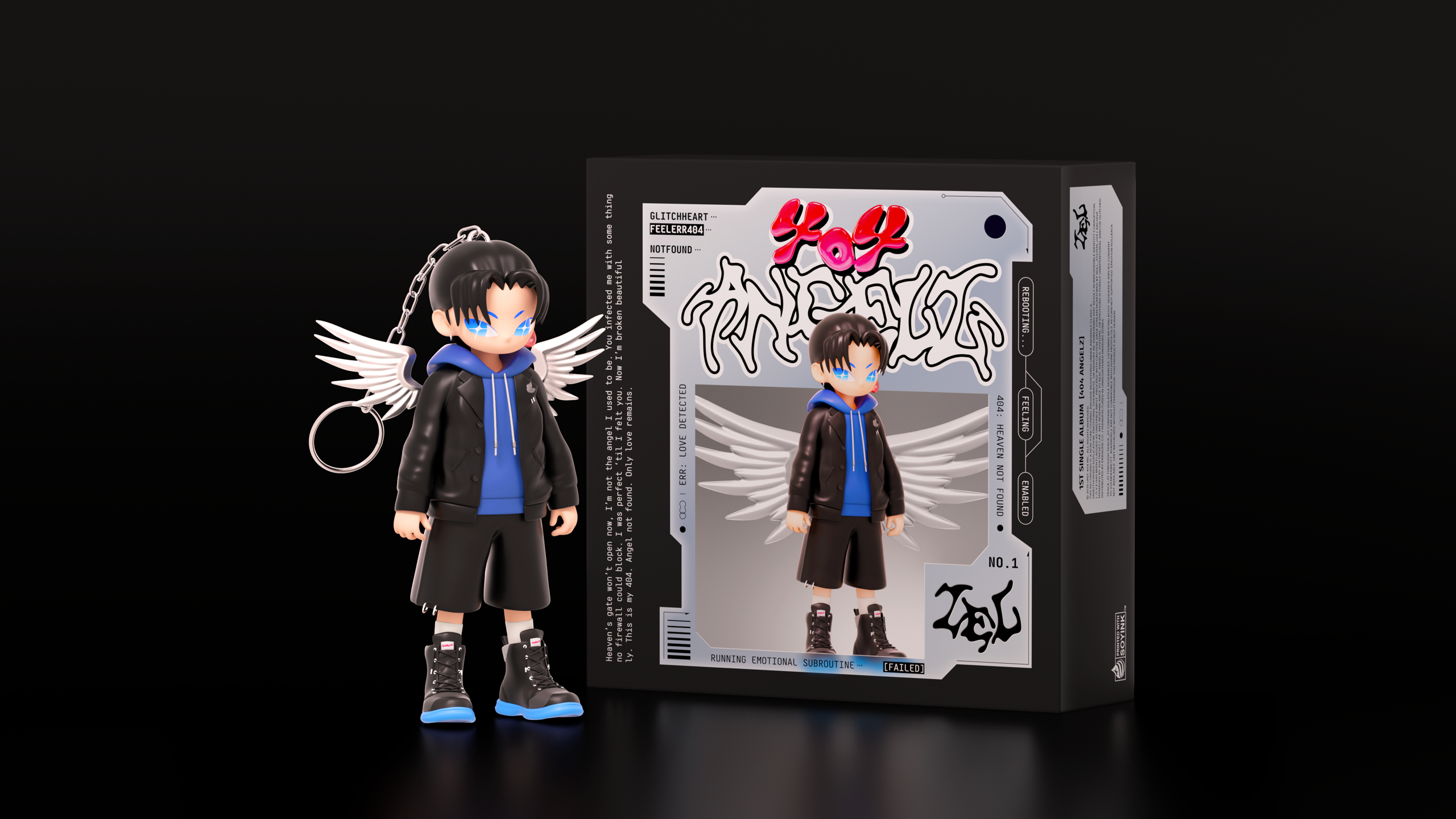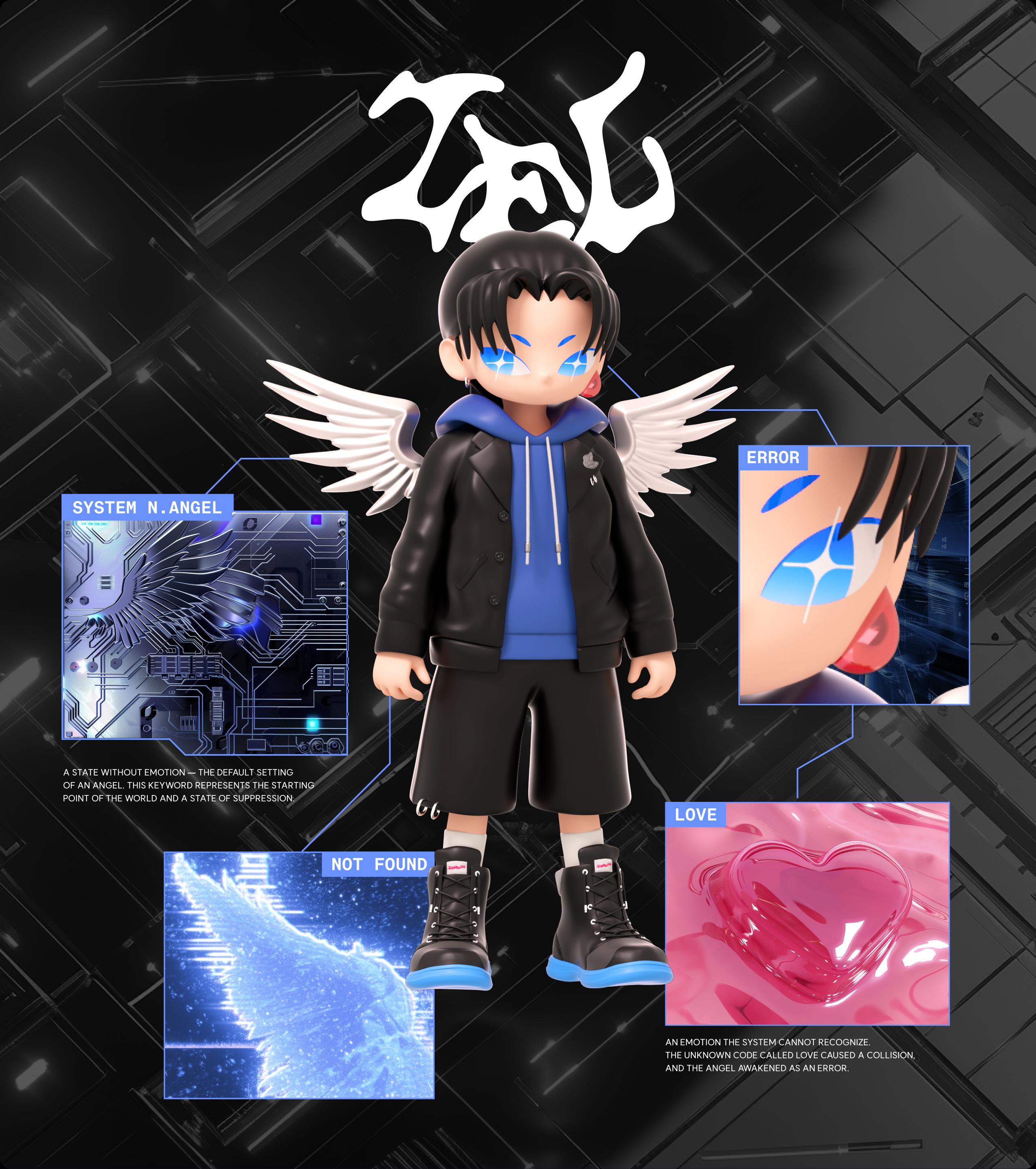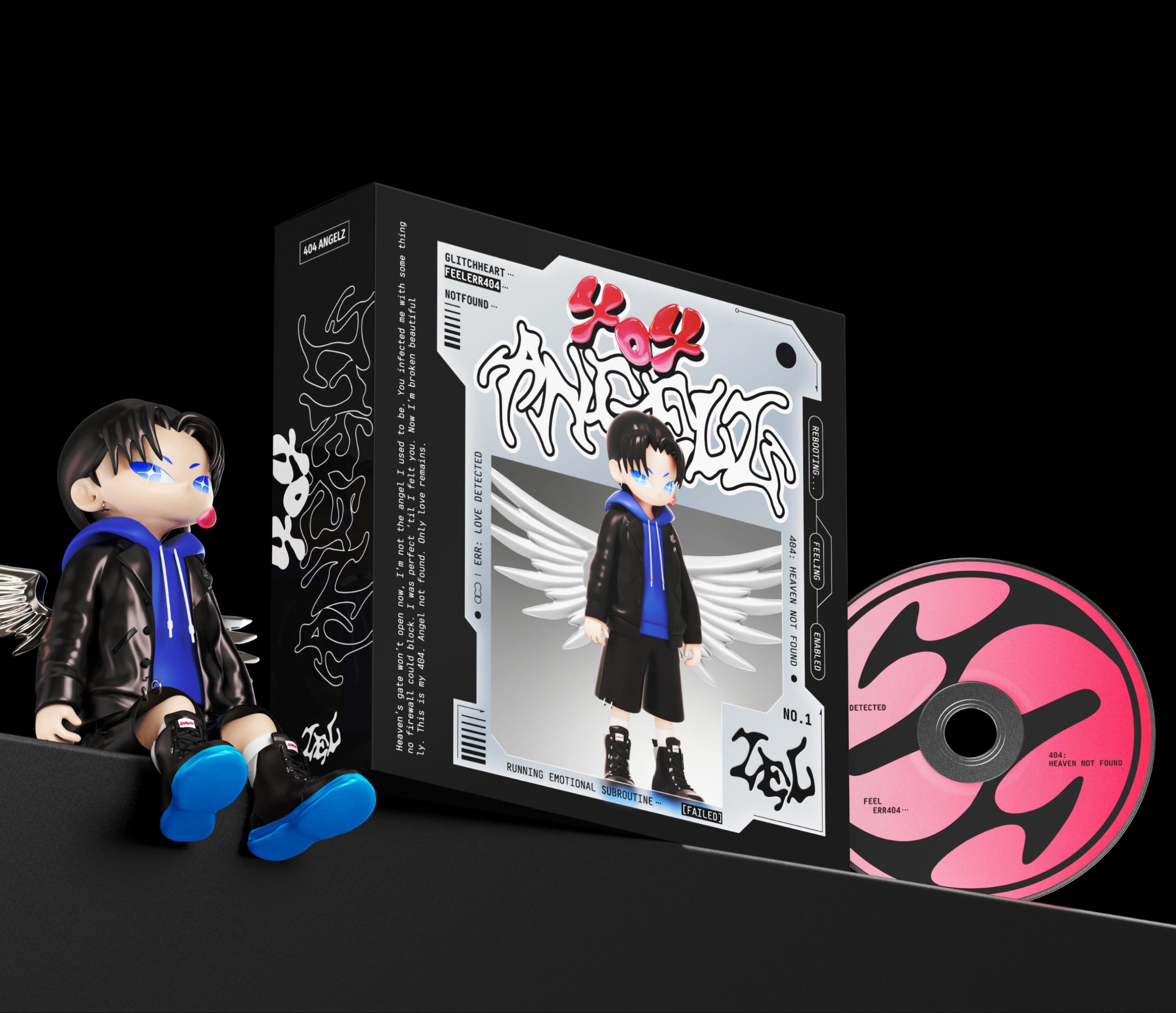 『404 ANGELZ』는 감정없이 설계된 안드로이드 천사가 '사랑(L.O.V.E)'이라는 예외적 변수에 노출되며 시스템상 존재 오류를 일으키고, AI천사로서의 정체성을 잃고 사랑이라는 감정을 키치하게 풀어낸 앨범